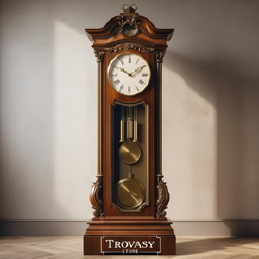 سَاعَة جَدٍّ قَدِيمَة بِنِظَامِ الرَّقَّاصِ وَعُلَبَةِ خَشَبِيَّةٍ مُزَخْرَفَة، تُعْزِفُ أَلْحَانًا كُلَّ سَاعَة.